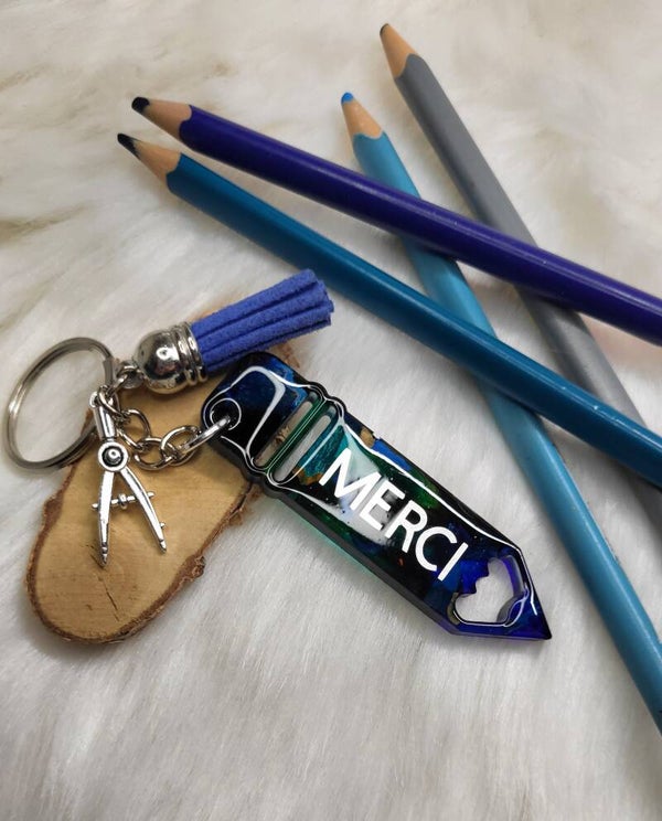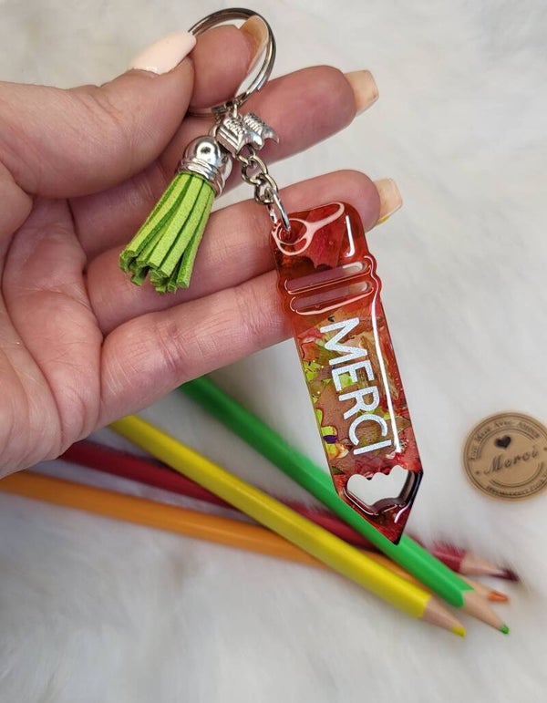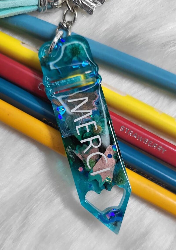 Créations porte-clés en résine époxy avec mots Merci et incrustations fleurs séchées,taille de crayons de couleurs paillettes en fonction de modèles.
