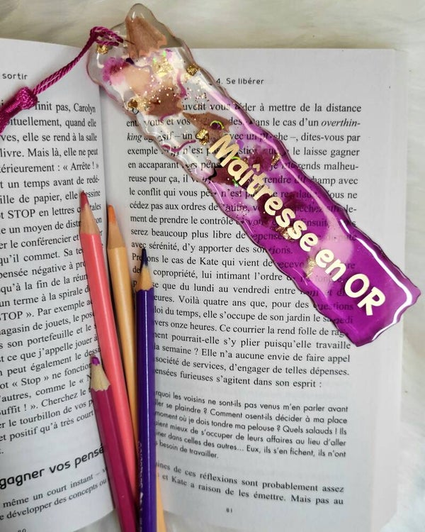 Créations marque page en résine époxy avec mots maitresse et incrustation fleurs séchées et paillettes selon modèles.